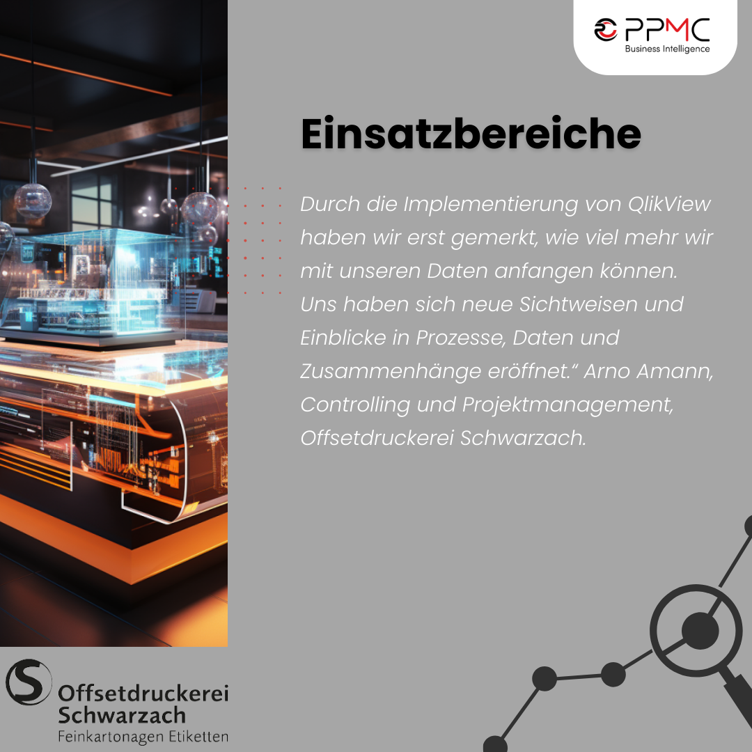 "Durch die Implementierung von QlikView haben wir erst gemerkt, wie viel mehr wir mit unseren Daten anfangen können. Uns haben sich neue Sichtweisen und Einblicke in Prozesse, Daten und Zusammenhänge eröffnet.“ Arno Amann, Controlling und Projektmanagement, Offsetdruckerei Schwarzach