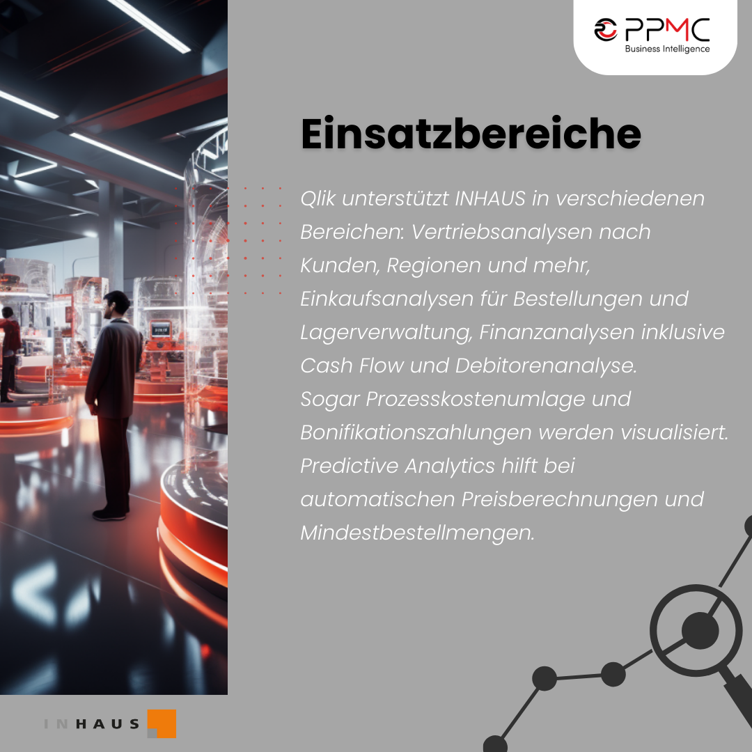 Wir von PPMC sind zertifizierte Qlik-Partner und unterstützten INHAUS bei Lizenzfragen und komplexen Anforderungen. Bereits seit 2007 sind wir anerkannte Experten für kundenspezifische Business-Intelligence Lösungen und Digitalisierungsberatung und bieten unseren Kund:innen von der Installation, der Entwicklung und Schulung bis hin zum Support rund um die Bereiche Data Integration und Data Analytics ein ganzheitliches Servicepaket.
